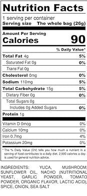 Ingredients: Yuca, Mushrooms, Onions, Sunflower Oil, Spices, Salt (Ingredients Listed On The Package Also Includes - Nacho {nutritional Yeast, Garlic Powder, Tomato Powder, Organic Flavor, Lactic Acid} Onion, Sea Salt).