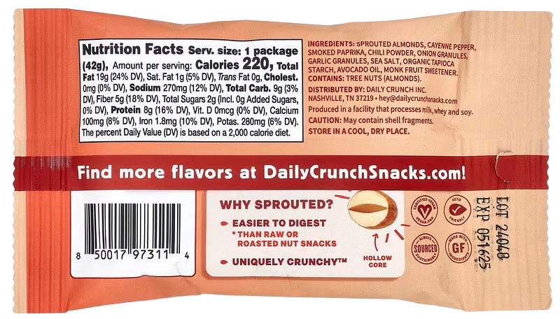 Daily Crunch Nashville Hot Sprouted Almonds offer a bold, spicy twist on their signature sprouted almonds, inspired by the iconic Nashville hot flavor.
