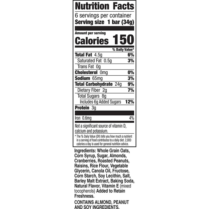 Ingredients: Whole Grain Oats, Corn Syrup, Almonds, Raisins, Sugar, Roasted Peanuts, Rice Flour, Vegetable Glycerin, Cranberries, Canola Oil, Fructose, Corn Starch, Soy Lecithin, Salt, Barley Malt Extract, Baking Soda, Natural Flavor. Vitamin E (Mixed Tocopherols) Added To Retain Freshness.Contains Almond, Peanut, And Soy Ingredients.