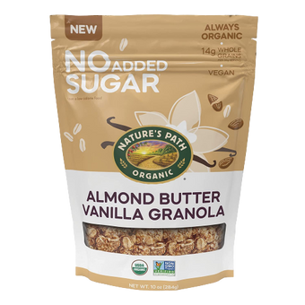 Nature’s Path Organic No Added Sugar Almond Butter Vanilla Granola Indugle in all the goodness of a crunchy, gratifying granola without the sugar kick. This delicious granola combines whole grain rolled oats, almond butter, and a touch of vanilla, all sweetened with natural date powder Boost your nutrition with this tasty granola, enriched with 14 grams of whole grains and almond butter for plant-based protein.