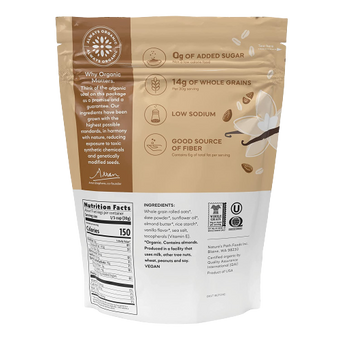 Ingredients: Organic Whole Grain Rolled Oats, Organic Date Powder, Organic Sunflower Oil, Organic Almond Butter, Organic Rice Starch, Organic Vanilla Flavor, Sea Salt, Tocopherols (Vitamin E).