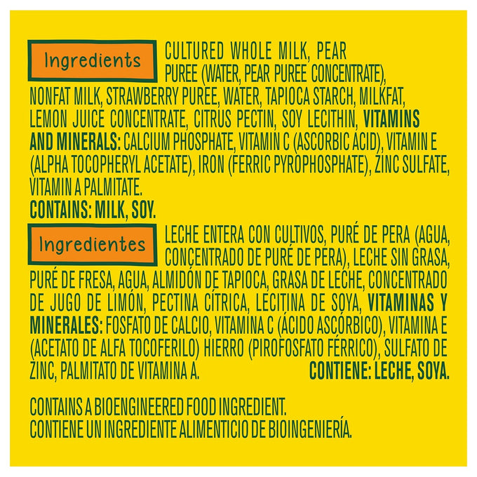 Ingredients: Cultured whole milk, pear puree (water, pear puree concentrate), nonfat milk, strawberry puree, water, tapioca starch, milkfat, lemon juice concentrate, citrus pectin, soy lecithin, calcium phosphate, vitamin C (ascorbic acid), vitamin E (alpha tocopheryl acetate), iron (ferric pyrophosphate), zinc sulfate, vitamin A palmitate.