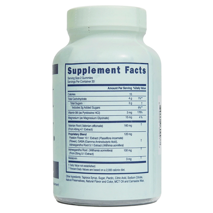 Ingredients: Valerian Root (160mg), Proprietary Botanical Blend (Passion Flower, GABA, Ashwagandha Root) (120mg), Ashwagandha Root (100mg), Magnesium (15mg), Vitamin B6 (3mg), Melatonin (3mg) Other ingredients: Tapioca Syrup, Sugar, Pectin, Citric Acid, Sodium Citrate, Natural Preservatives, Natural Flavor and color, MCT Oil, Carnauba Wax. Gluten-free, Vegan, Non-GMO *These statements have not been evalutated by the Food and Drug Administration. This product is not intended to diagnose, treat, cure, or prevent any disease.