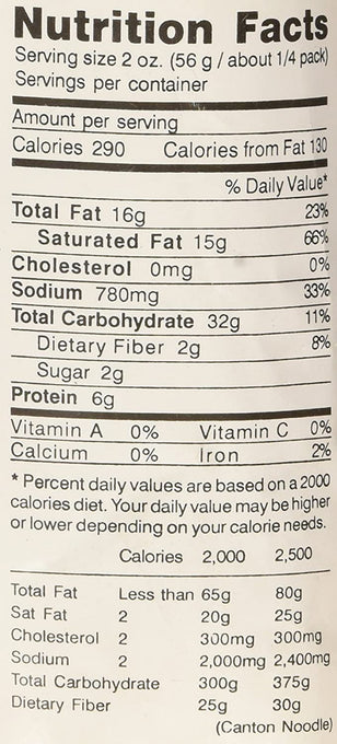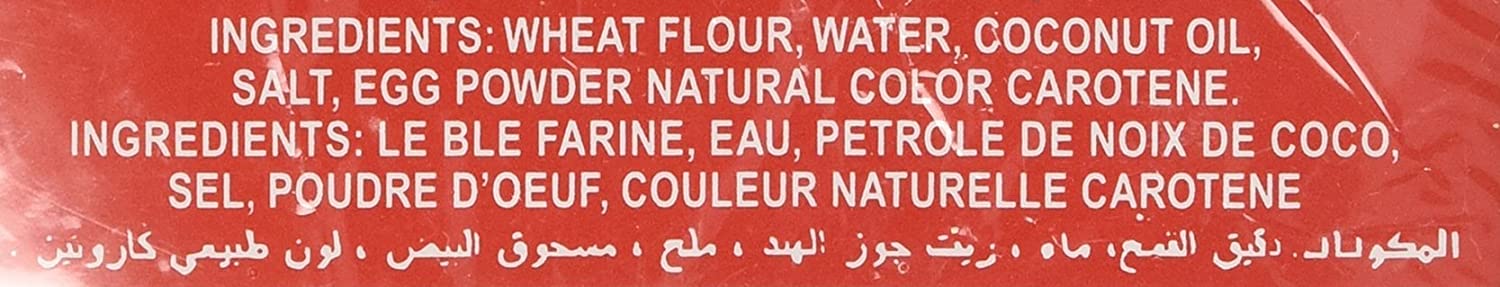 Ingredients: Wheat Flour, Water, Coconut Oil, Salt, Egg Powder, Natural Color Carotene.