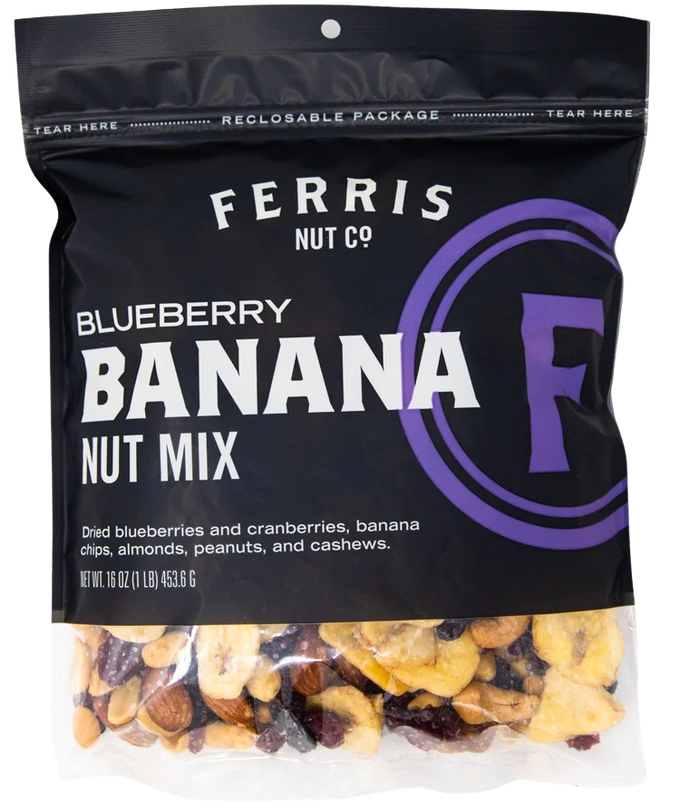 Ingredients: Dried Cranberries (Cranberries, Sugar, Sunflower Oil), Almonds, Peanuts, Cashews, Dried Blueberries (Blueberries, Sugar, Sunflower Oil), Banana Chips (Bananas, Vegetable Oil, Sugar, Natural Banana Flavor), Peanut Oil, Salt.