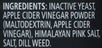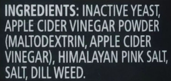 Ingredients: Inactive Yeast (Inactive Yeast, Thiamine Hydrochloride (Vitamin B1), Riboflavin (Vitamin B2), Nicotinic Amide (Vitamin B3), Calcium D-pantothenate (Vitamin B5), Pyridoxine Hydrochloride (Vitamin B6), Folic Acid (Vitamin B9), Cyanocobalamin (Vitamin B12), Zinc Sulfate), Apple Cider Vinegar Powder (Maltodextrin, Apple Cider Vinegar), Himalayan Pink Salt, Salt, Dill Weed.