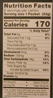 Ingredients: Oats, Almonds, Semi-Sweet Chocolate (Sugar, Unsweetened Chocolate, Cocoa Butter, Soy Lecithin, Vanilla Extract), Cane Sugar, Sea Salt, Natural Flavor.