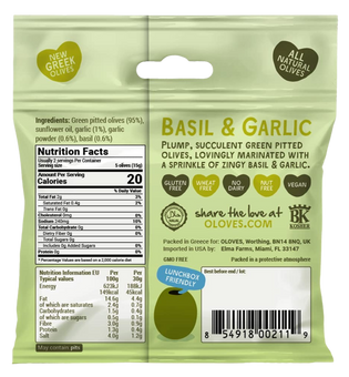 Ingredients: Pitted Green Olives96%, Salt, Sunflower Oil, Basil