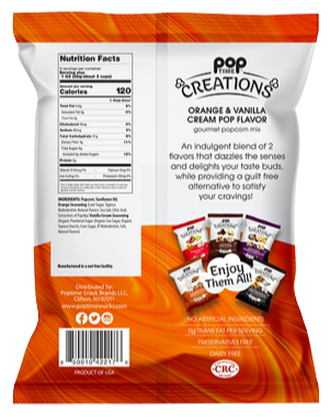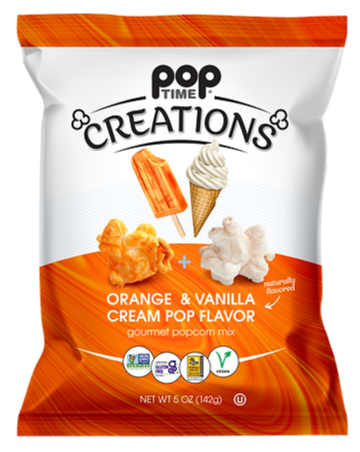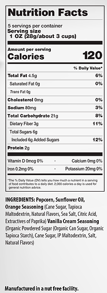 Ingredients: Popcorn, Sunflower Oil, Orange Seasoning( Cane Sugar, Tapioca Maltodextrin, Natural Flavours, Sea Salt, Citric Acid, Extractives Of Paprika) Vanilla Cream Seasoning (Organic Powdered Sugar (Organic Can Sugar, Organic Tapioca Starch), Cane Sugar, Ip Maltodextrin, Salt, Natural Flavors)