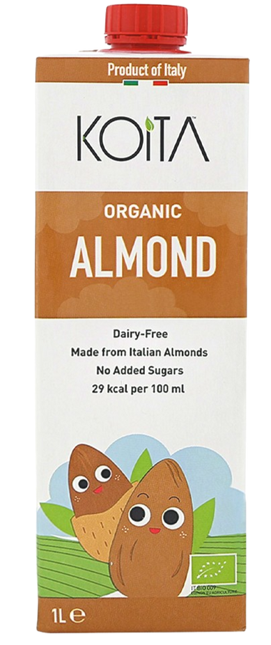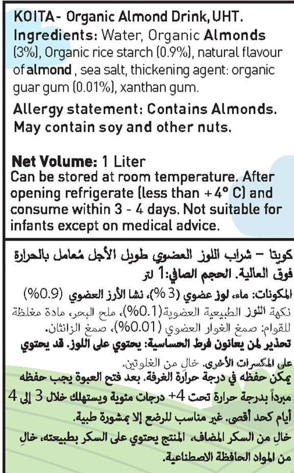 Ingredients: Water, Organic Almonds (3%), Organic rice starch, Natural Almonds flavor, thickening agent: Gellan gum, sea salt.