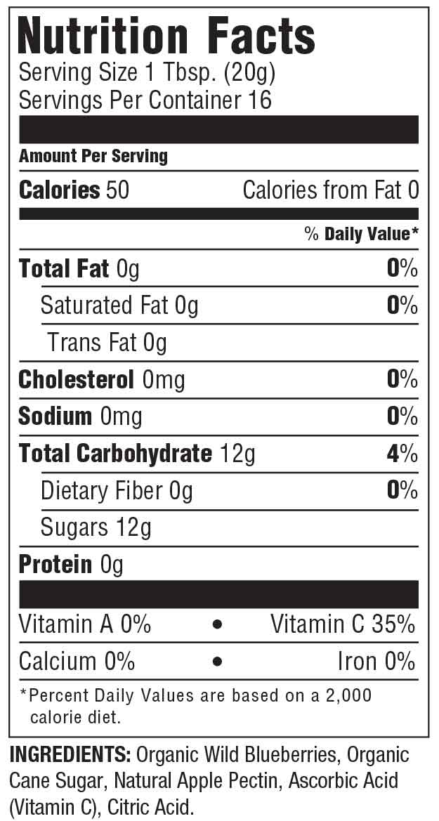 Ingredients: Organic Wild Blueberries, Organic Cane Sugar, Natural Apple Pectin, Ascorbic Acid (Vitamin C), Citric Acid.