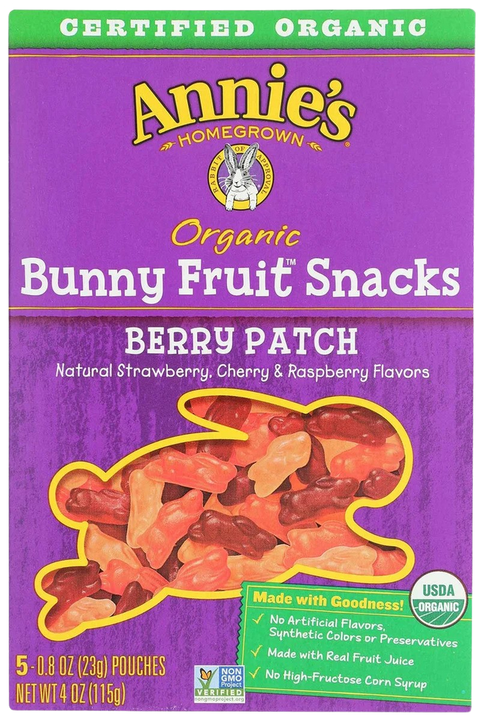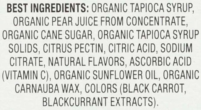 Ingredients: Organic Rice Syrup, Organic Cane Sugar, Organic Tapioca Syrup Solids, Water, Organic Pear Juice Concentrate, Pectin, Citric Acid, Sodium Citrate, Ascorbic Acid (vitamin C), Organic Natural Flavor, Organic Sunflower Oil, Organic Color (organic black carrot, organic black currant extracts), Organic Carnauba Wax.