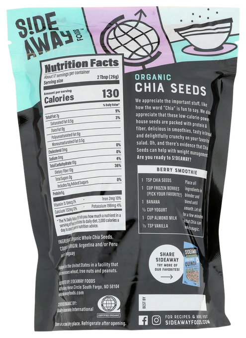 Sideaway Foods is known for delivering nutrient-rich pantry staples that turn wholesome ingredients into everyday staples. The Organic Chia Seeds are a versatile superfood packed with plant-based power to elevate smoothies, salads, and baked goods.