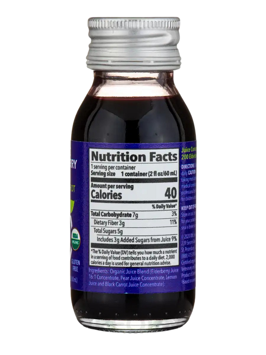 Ingredients: Organic Juice Blend (Elderberry Juice 16:1 Concentrate, Pear Juice Concentrate, Lemon Juice And Black Carrot Juice Concentrate).