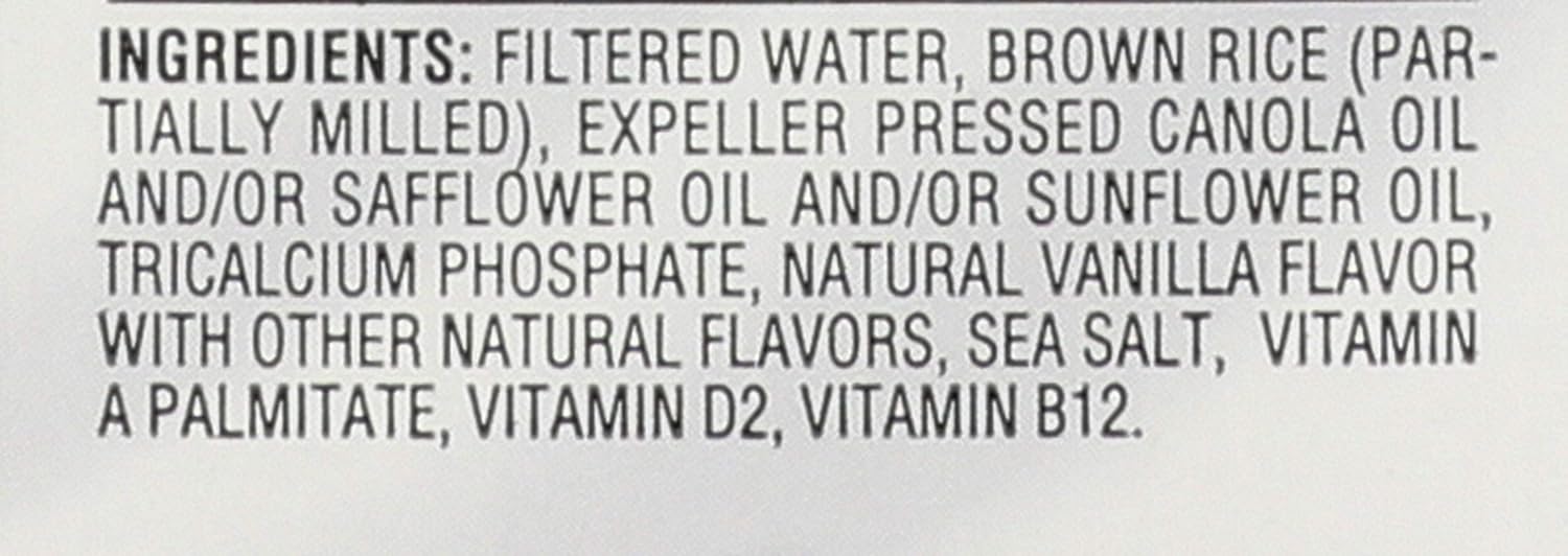 Ingredients: Ricemilk (Water, Hydrolyzed Rice), Canola Oil And/Or Sunflower Oil, Tricalcium Phosphate, Natural Flavor, Sea Salt, Vitamin A Palmitate, Vitamin D2 (Ergocalciferol), Vitamin B12 (Cyanocobalamin).
