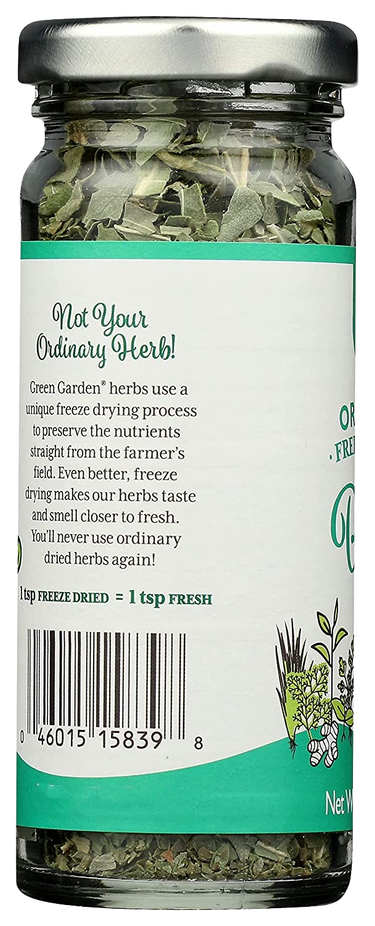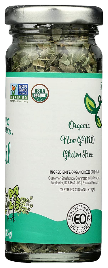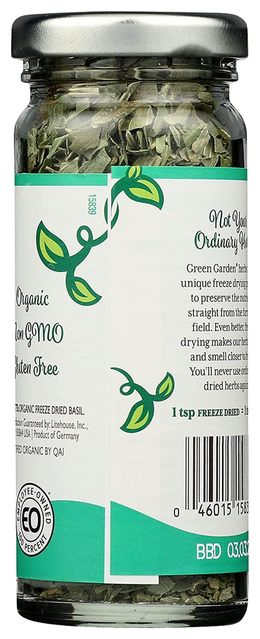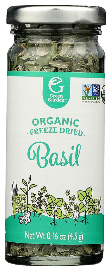 FREEZE-DRIED ORGANIC BASIL - Green Garden Freeze Dried Basil is organic & stored in a jar to maintain freshness. Made without sacrificing flavor, you will never want to go back to ordinary dried basil
