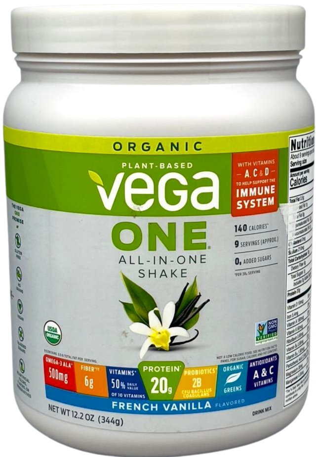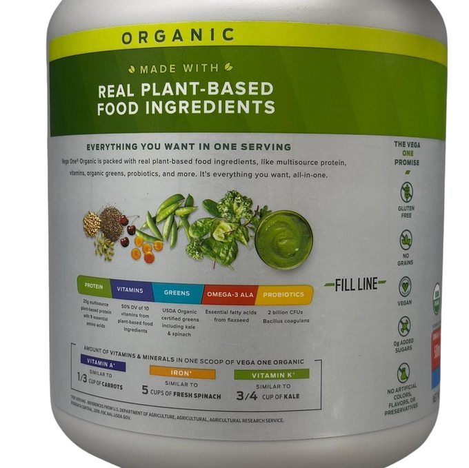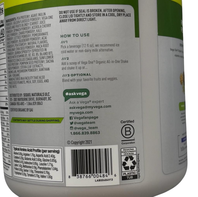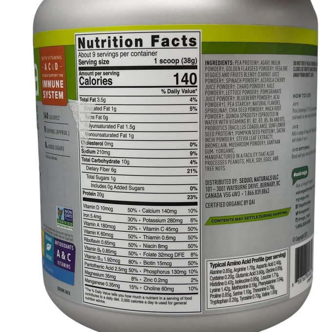 Ingredients: Pea Protein†, Vega One Veggies And Fruits Blend† (Carrot Juice Powder†, Spinach Powder†, Acerola Cherry Juice Powder†, Chard Powder†, Kale Powder†, Lettuce Powder†, Pomegranate Juice Powder†, Blueberry Juice Powder†, Acai Powder†), Golden Flaxseed†, Pea Starch†, Agave Inulin Powder†, Natural Flavors, Spirulina†, Quinoa Sprouts† (Sprouted In Water With Vitamins B1, B2, B3, B5, B6, And B7), Chia Seed Powder†, Maca Root Powder†, Sunflower Seed Protein†, Pumpkin Seed Protein†, Sacha Inchi Powder†, Stevia Extract†, Citric Acid, Probiotics (Bacillus Coagulans), Xanthan Gum, Bromelain, Mushroom Powder†. †Organic