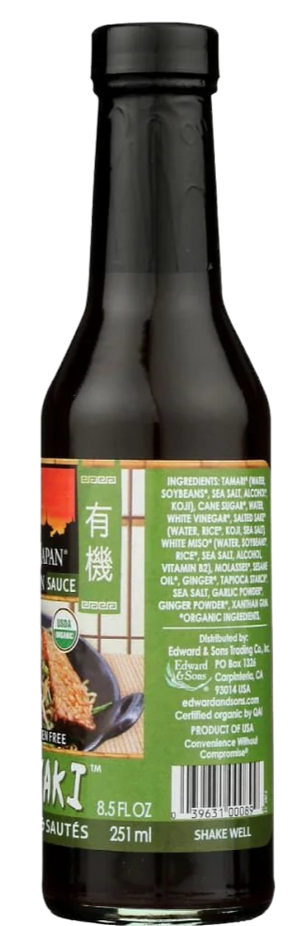 Ingredients: Tamari* (Water, Soybeans*, Sea Salt, Alcohol*, Koji), Cane Sugar*, Water, White Vinegar*, Salted Sake* (Water, Rice*, Koji, Sea Salt), White Miso* (Water, Soybeans*, Rice*, Sea Salt, Alcohol, Vitamin B2), Molasses*, Sesame Oil*, Ginger*, Tapioca Starch*, Sea Salt, Garlic Powder*, Ginger Powder*, Xanthan Gum.