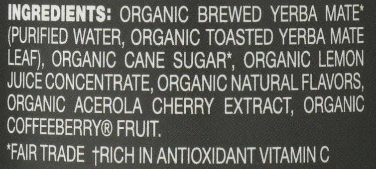 Ingredients: Organic Brewed Yerba Mate (Purified Water, Organic Toasted Versa We Leaf), Organic Cane Sugar, Organic Lemon Juice Concentrate, Organic Natural Flavors, Organic Acerola Cherry Extract, Organic Coffeeberry Fruit.