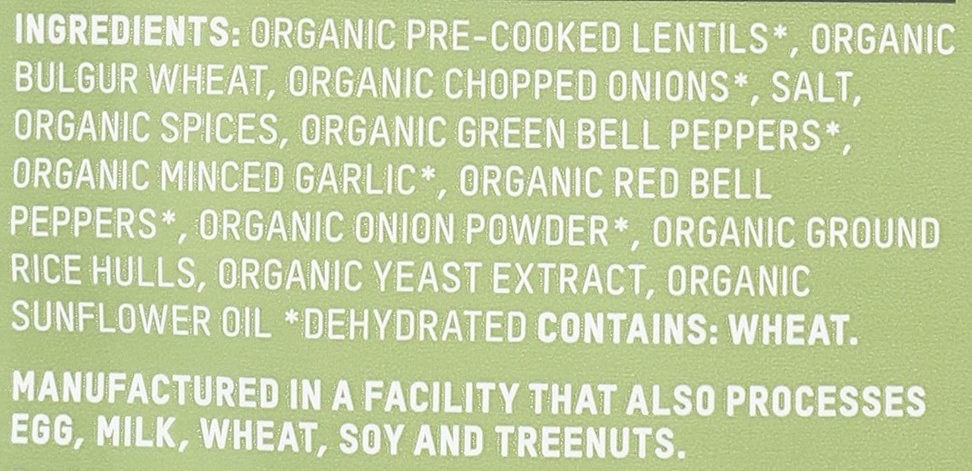 Ingredients: organic pre-cooked lentils*, organic bulgur wheat, organic chopped onion*, salt, organic spices, organic green bell pepper*, organic minced garlic*, organic red bell pepper*, organic onion powder*, organic ground rice hulls, organic yeast extract, organic sunflower oil *dehydrated Manufactured in a facility that also processes egg, milk, wheat, soy and tree nuts.