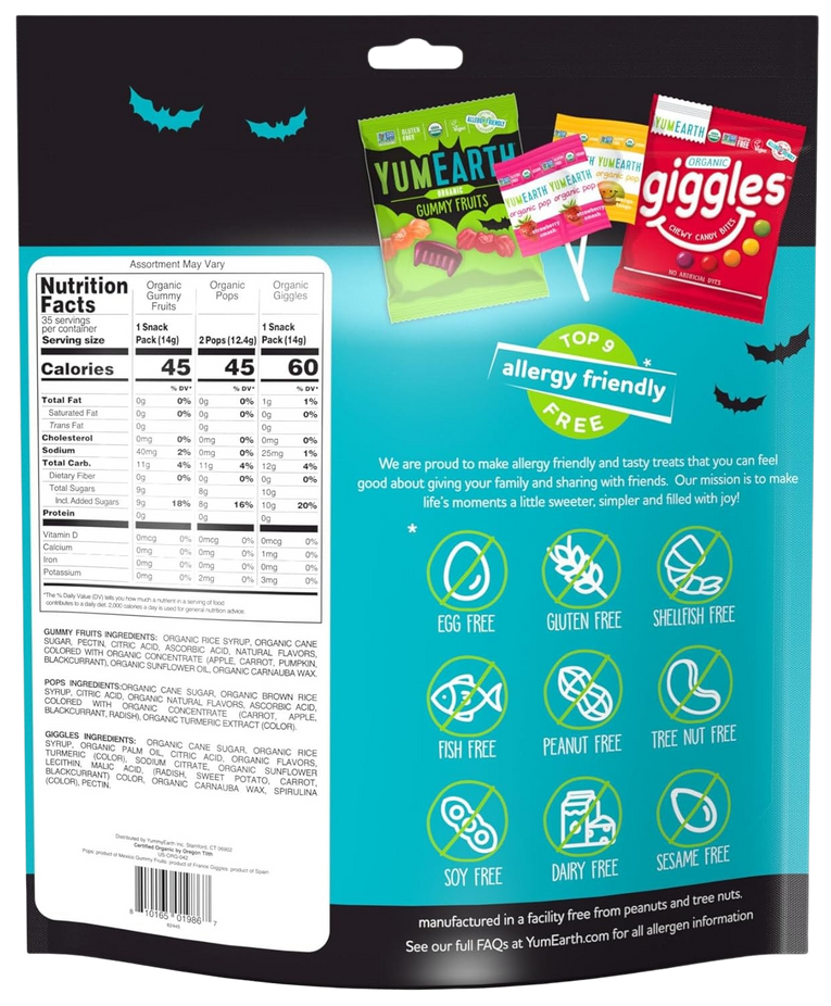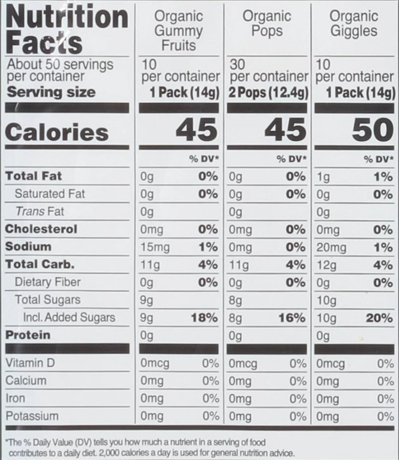 Ingredients: Gummy Fruits Ingredients: Organic Rice Syrup, Organic Cane Sugar, Pectin, Citric Acid, Natural Flavors, Ascorbic Acid, Cocolred With Organic Concentrate (Apple, Carrot, Pumpkin, Blackcurrant), Organic Sunflower Oil, Organic Carnauba Wax. LolliPops Ingredients: Organic Cane Sugar, Organic Brown Rice Syrup, Citric Acid, Natural Flavors, Ascorbic Acid, Colored With Organic Concentrate (Carrot, Apple, Blackcurrant, Radish, Turmeric (Color). Giggles Ingredients: Organic Cane Sugar, Organic Rice Syrup, Organic Palm Oil, Citric Acid, Organic Natural Flavors, Turmeric Palm Oil, Citric Acid, Organic Natural Flavors, Turmeric (Color), Sodium Citrate, Organic Sunflower Lecithin Malic Acid, Colored With Concentrate (Carrot, Radish, Blackcurrant, Sweet Poptato), Organic Carnauba Wax, Spirulina (Color), Pectin.`