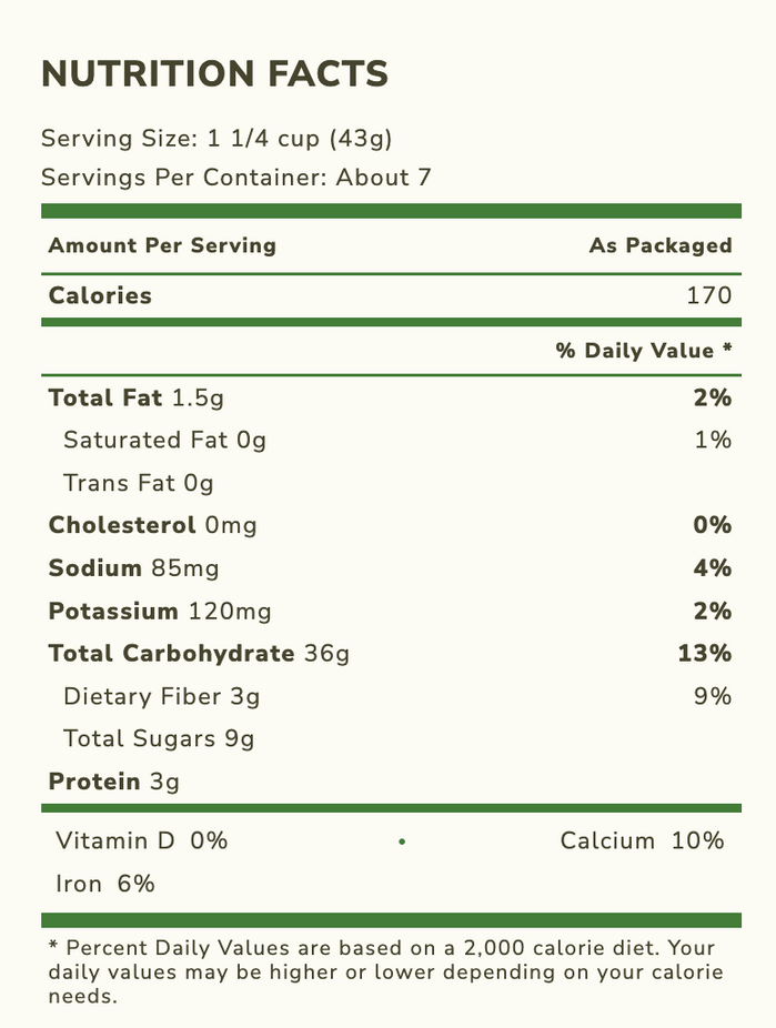 Ingredients: Whole Grain Corn Meal*, Whole Grain Sorghum Flour*, Cane Sugar*, Dried Sweet Potato*, Chickpea Flour*, Sunflower Oil*, Honey*, Calcium Carbonate, Sea Salt, Molasses*, Natural Flavor, Vanilla Extract*, Vitamin E (mixed tocopherols) Added to Preserve Freshness.