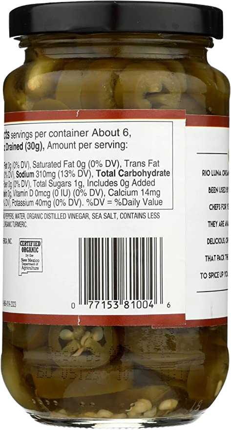 Ingredients: Organic Jalapeño Peppers, Water, Organic Distilled Vinegar, Sea Salt, Contains Less Than 2% Of Calcium Chloride, Organic Turmeric.