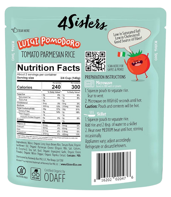 Organic Ready to Eat Rice – Luigi Pomodoro is a kid-friendly, heat-and-eat meal featuring organic brown rice and Parmesan cheese. Ready in just 60 seconds, it’s a hassle-free, wholesome option for busy parents, college students, and anyone craving a quick, tasty meal.
