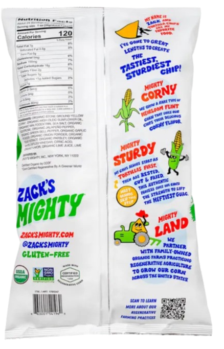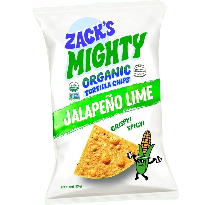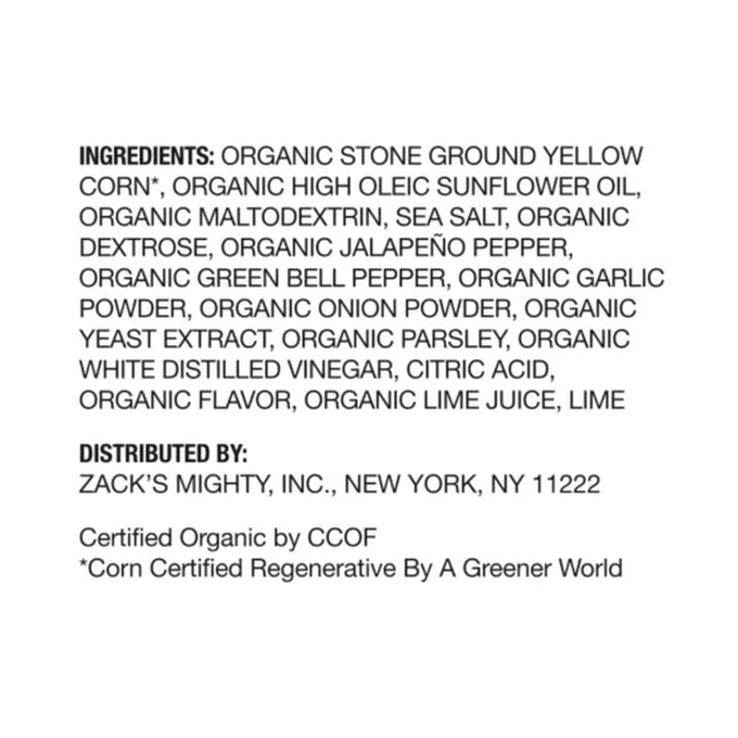 Ingredients: Organic Stone Ground Yellow Corn*, Organic High Oleic Sunflower Oil, Organic Maltodextrin, Sea Salt, Organic Dextrose, Organic Jalapeño Pepper, Organic Green Bell Pepper, Organic Garlic Powder, Organic Onion Powder, Organic Yeast Extract, Organic Parsley, Organic White Distilled Vinegar, Citric Acid, Organic Flavor, Organic Lime Juice, Lime.