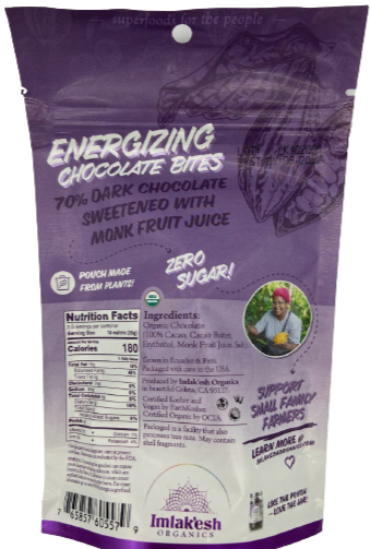 Ingredients: Organic Chocolate (100% Cacao, Cacao Butter, Erythritol, Monk Fruit Juice, Salt).
