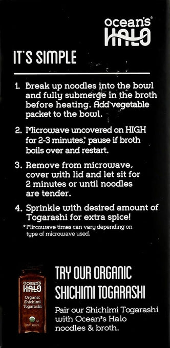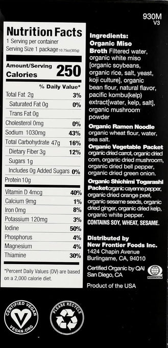 Ingredients: Organic Miso Broth (Organic Kelp Stock [filtered Water Organic Kelp], Organic Miso [organic Soybeans, Organic Rice, Salt, Yeast, Koji Culture], Organic Bean Flour, Natural Flavor, Organic Mushroom Powder, Organic Ramen Noodle (Organic Wheat, Water, Sea Salt), Organic Tofu Packet: (Organic Dried Tofu).