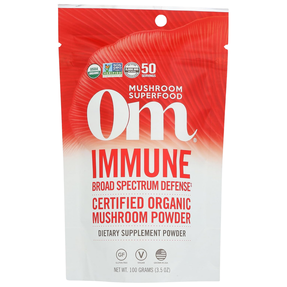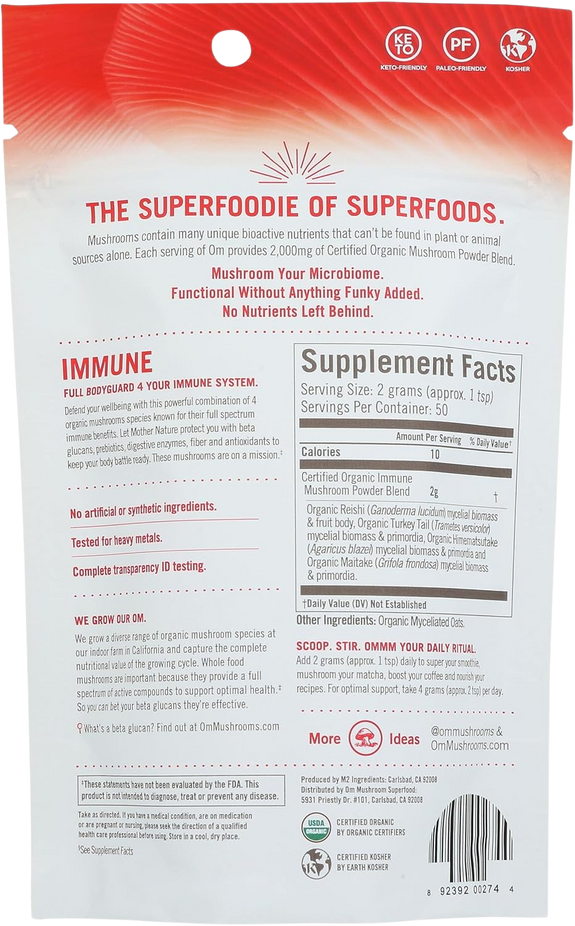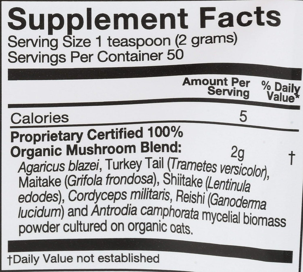 Ingredients: Certified Organic Immune Mushroom Powder Blend: Organic Reishi (Ganoderma Lucidum) Mycelial Biomass & Fruit Body, Organic Turkey Tail (Trametes Versicolor) Mycelial Biomass & Primordia, Organic Himematsutake (Agaricus Blazei) Mycelial Biomass & Primordia And Organic Maitake (Grifola Frondosa) Mycelial Biomass & Primordia, Organic Myceliated Oats.