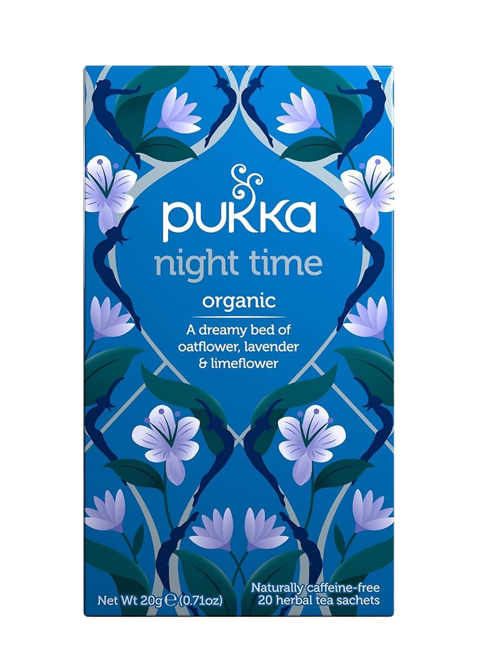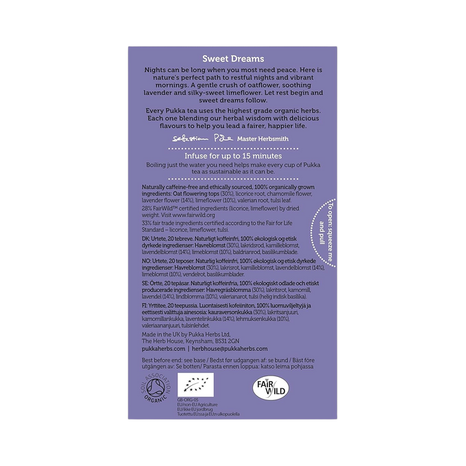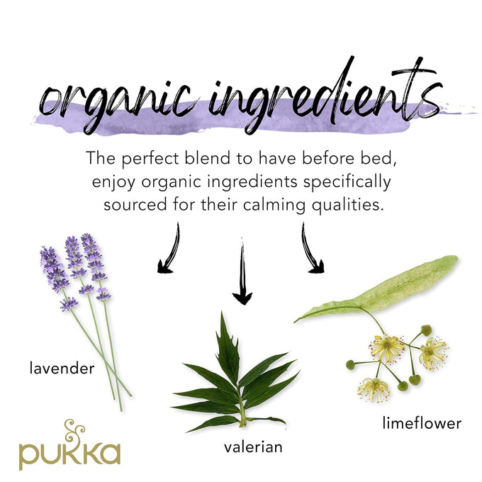 Ingredients: Oat flowering tops*, chamomile flower*, licorice root*, lavender flower*, limeflower*, tulsi leaf*, valerian root. (*organic).