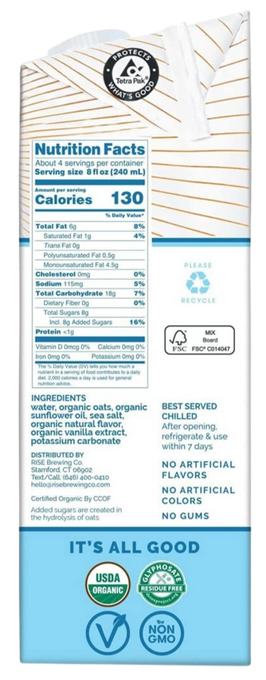 Ingredients: Water, organic oat flour, organic sunflower oil, sea salt, organic natural flavour, organic vanilla extract