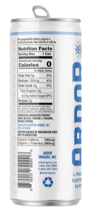 Ingredients: Carbonated Purified Water, Sea Salt, Organic L-Theanine, Organic Caffeine.