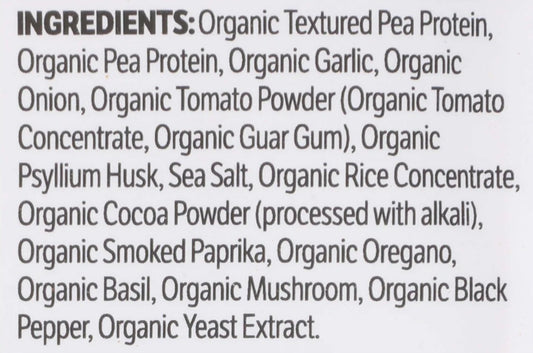 Ingredients: Organic Textured Pea Protein, Organic Pea Protein, Organic Garlic, Organic Onion, Organic Tomato Powder (Organic Tomato Concentrate, Organic Guar Gum), Organic Psyllium Husk, Sea Salt, Organic Rice Concentrate, Organic Cocoa Powder (Processed With Alkali), Organic Smoked Paprika, Organic Oregano, Organic Basil, Organic Mushroom, Organic Black Pepper, Organic Yeast Extract.