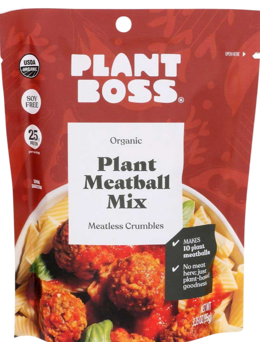 PLANT-BASED HAPPY PLACE - Plant Boss Plant Organic Meatball Mix features meatless crumbles blended with organic seasonings, including onion, oregano, and basil. Simply combine with water and a little oil, shape, and bake. Meatballs will never be the same.