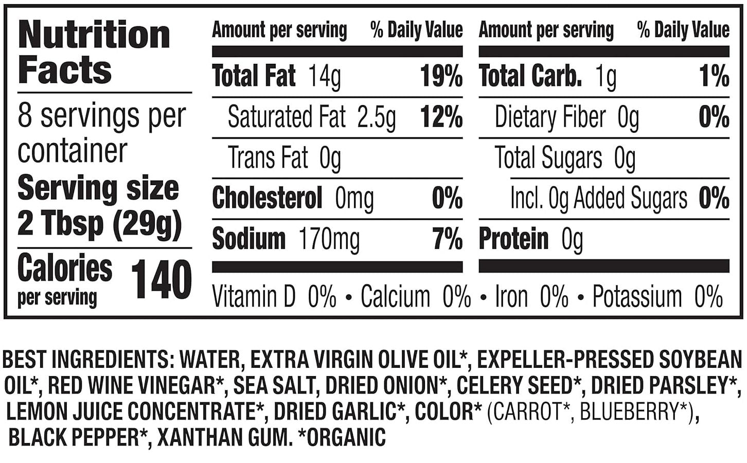 Ingredients: Water, Extra Virgin Olive Oil*, Expeller-pressed Soybean Oil*, Red Wine Vinegar*, Sea Salt, Dried Onion*, Celery Seed*, Dried Parsley*, Lemon Juice Concentrate*, Dried Garlic*, Color* (Carrot*, Blueberry*), Black Pepper*, Xanthan Gum. *organic