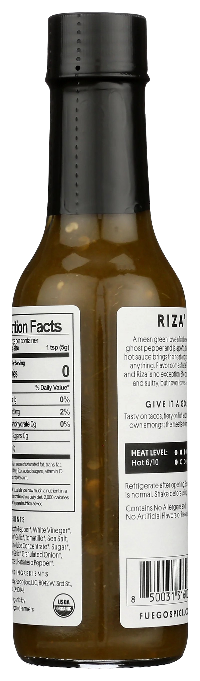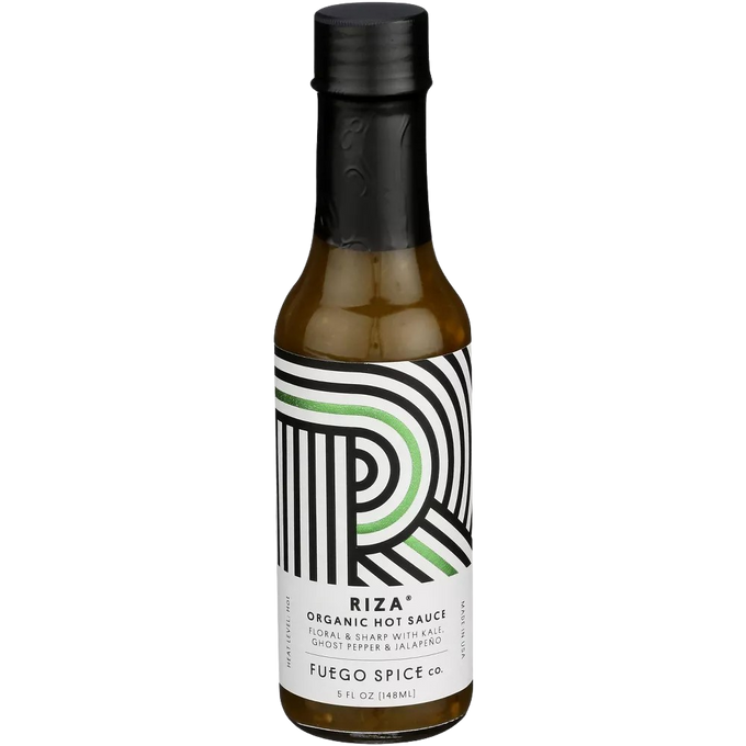 The Organic Riza Hot Sauce is a vibrant blend of ghost pepper and jalapeño, delivering a slow, sultry burn that enhances any dish.