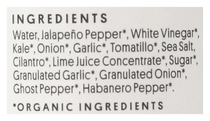 Ingredients: Water, Jalapeño Pepper*, White Vinegar*, Kale*, Onion*, Garlic*, Tomatillo*, Sea Salt, Cilantro*, Lime Juice Concentrate*, Sugar*, Granulated Garlic*, Granulated Onion*, Ghost Pepper*, Habanero Pepper*. *organic Ingredients.