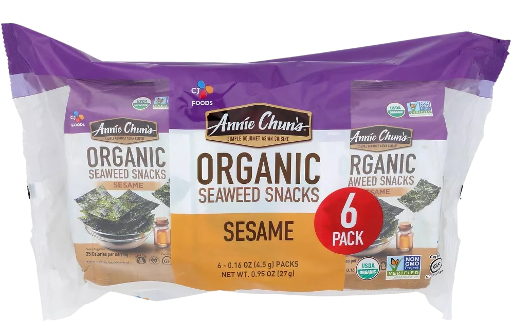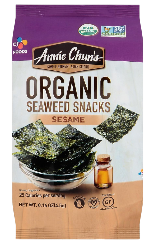 Ingredients: Organic Dried Seaweed, Organic Sunflower Oil, Organic Teriyaki Seasoning (organic Cane Sugar, Organic Tamari Soy Sauce [organic Soybeans, Salt], Organic Maltodextrin, Salt, Organic Spices, Organic Yeast Extract, Organic Rice Concentrate, Organic Onion Powder, Organic Sunflower Oil, Natural Flavors, Organic Natural Flavors), Organic Rosemary Extract (for Freshness).