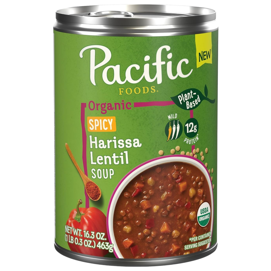 Pacific Foods Organic Spicy Harissa Lentil Soup brings bold, plant-based flavor to your bowl with a satisfying blend of lentils, chickpeas, vegetables, and spices.
