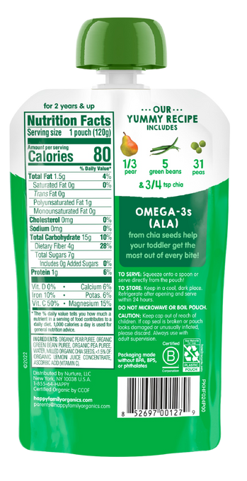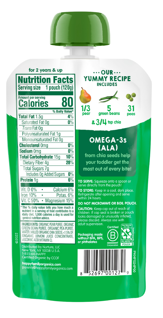 Ingredients: Organic Pear Puree; Organic Pea Puree; Organic Green Bean Puree; Milled Organic Chia Seed; Ascorbic Acid (Vitamin C); Organic Lemon Juice Concentrate