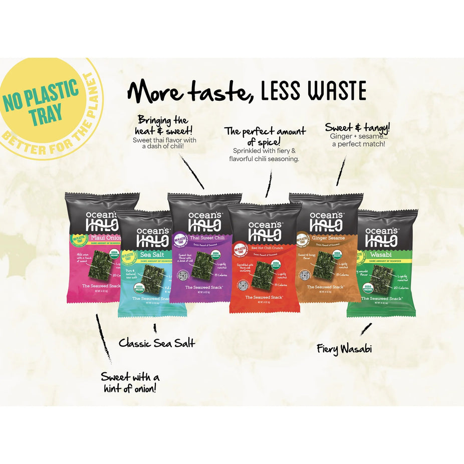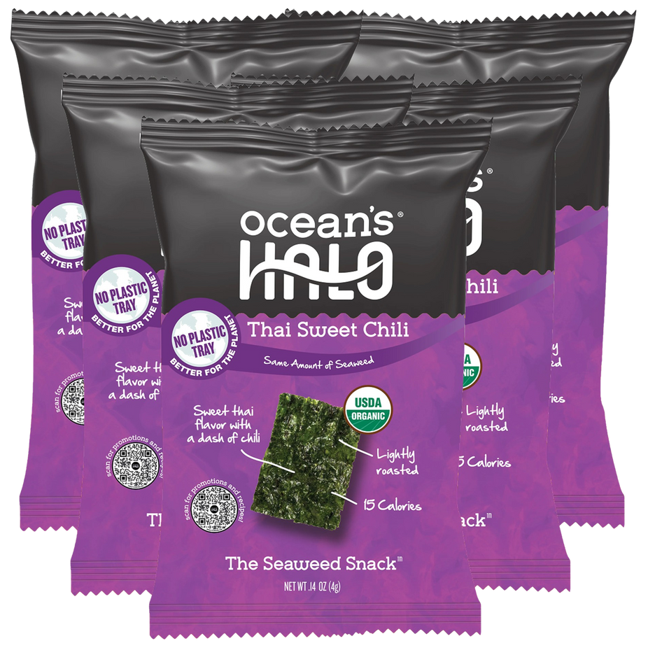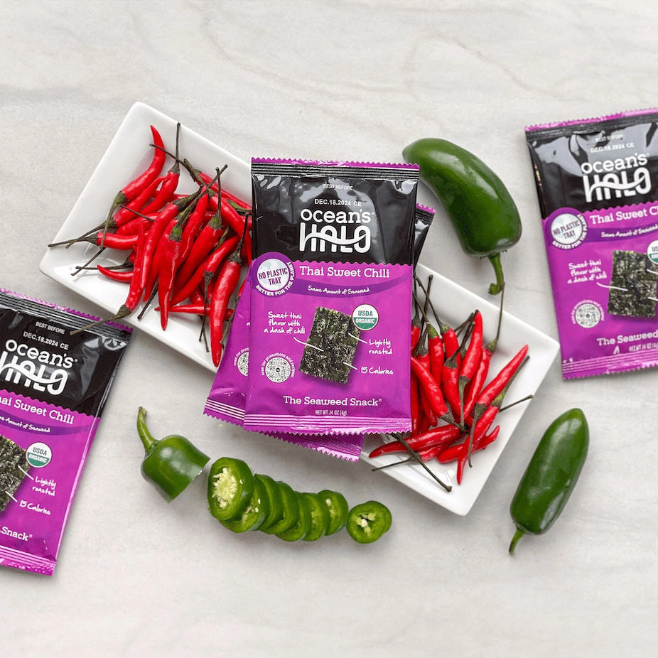 Ocean’s Halo Organic Thai Sweet Chili Trayless Seaweed Snacks deliver a sweet and spicy kick in a light, crispy bite—now with less waste and more flavor.