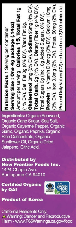 Ingredients: Organic Seaweed, Organic Cane Sugar, Sea Salt, Organic Cayenne Pepper, Organic Garlic, Organic Paprika, Organic Rice Concentrate, Organic Sunflower Oil, Organic Dried Jalapeno, Citric Acid.