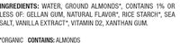 Ingredients: Water, Ground Almonds*, Contains 1% Or Less Of: Gellan Gum, Natural Flavor*, Rice Starch*, Sea Salt, Vanilla Extract*, Vitamin D2, Xanthan Gum. *Organic Contains: Almonds