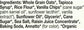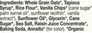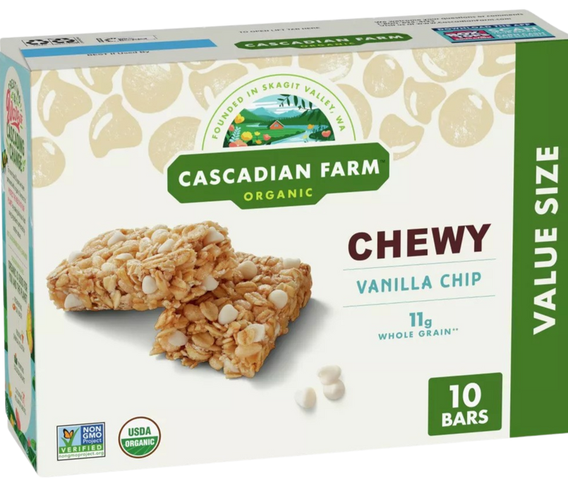 Ingredients: Whole Grain Oats*, Tapioca Syrup*, Rice Flour*, Vanilla Chips* (cane sugar*, palm kernel oil*, sunflower lecithin*, vanilla extract*), Sunflower Oil*, Glycerin*, Cane Sugar*, Sea Salt, Raisin Juice Concentrate*, Baking Soda, Annatto* (for color). *Organic