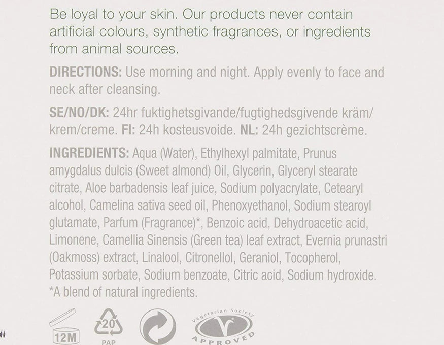 Ingredients: Aqua (water), Ethylhexyl Palmitate, Prunus Amygdalus Dulcis (sweet almond) Oil, Glycerin, Glyceryl Stearate Citrate, Aloe Barbadensis Leaf Juice, Sodium Polyacrylate, Cetearyl Alcohol, Camelina Sativa Seed Oil, Phenoxyethanol, Sodium Stearoyl Glutamate, Parfum (fragrance)*, Benzoic Acid, Dehydroacetic Acid, Limonene, Camellia Sinensis (green tea) Leaf Extract, Evernia Prunastri (oakmoss) Extract, Linalool, Citronellol, Geraniol, Tocopherol, Potassium Sorbate, Sodium Benzoate, Citric Acid, Sodium Hydroxide.