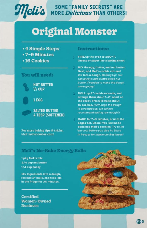 Ingredients: Gluten-free Rolled Oats, Brown Sugar, Sugar, Chocolate Chips (Sugar, Unsweetened Chocolate, Cocoa Butter, Soy Lecithin, Natural Vanilla Extract), M&m Milk Chocolate (Milk Chocolate [sugar, Chocolate, Skim Milk, Cocoa Butter, Lactose, Milkfat, Soy Lecithin, Salt, Artificial Flavor], Sugar, Cornstarch, Less Than 1%: Corn Syrup, Dextrin, Coloring [includes, Blue 1 Lake, Yellow 6, Red 40, Yellow 5, Blue 1, Red 40 Lake, Blue 2 Lake, Yellow 6 Lake, Blue 2], Gum Acacia), Baking Soda, Natural Vanilla Powder (Dextrose, Vanilla), Salt.