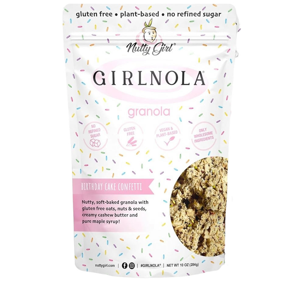 Nutty Girl Original Granola in Birthday Cake flavor brings a celebratory twist to soft-baked granola clusters with rich nut butters and irresistible sweetness.